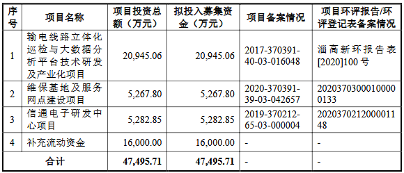 信通电子最终募集资金净额比原计划多8,867.49万元。信通电子2025年6月26日披露的招股书显示,公司拟募集资金47,495.71万元,计划用于输电线路立体化巡检与大数据分析平台技术研发及产业化项目、维保基地及服务网点建设项目、信通电子研发中心项目、补充流动资金。