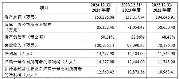 2022年至2024年,公司实现营业收入分别为78,176.30万元、93,090.25万元、100,506.14万元,归属于母公司所有者的净利润分别为11,745.90万元、12,404.00万元、14,277.98万元,扣除非经常性损益后归属于母公司所有者的净利润分别为10,968.41万元、10,873.36万元、12,560.42万元。
