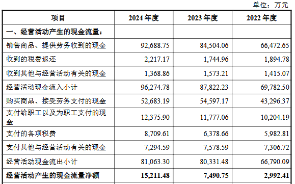上述同期,公司经营活动产生的现金流量净额分别为2,992.41万元、7,490.75万元、15,211.48万元,销售商品、提供劳务收到的现金分别为66,472.65万元、84,504.06万元、92,688.75万元。