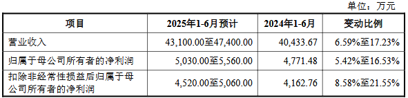 公司预计2025年1-6月将实现营业收入43,100.00万元至47,400.00万元,同比增长6.59%至17.23%;预计2025年1-6月将实现归属于母公司所有者的净利润5,030.00万元至5,560.00万元,同比增长5.42%至16.53%;预计2025年1-6月将实现扣除非经常性损益后归属于母公司所有者的净利润4,520.00万元至5,060.00万元,同比增长8.58%至21.55%。