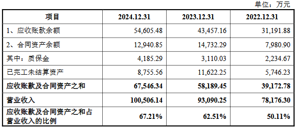 信通电子存在应收账款及合同资产坏账或减值风险。2022年12月31日至2024年12月31日,公司应收账款及合同资产余额分别为39,172.78万元、58,189.45万元和67,546.34万元,应收账款坏账准备及合同资产减值准备金额合计分别为2,510.37万元、4,129.17万元和5,742.17万元,应收账款及合同资产余额占营业收入的比例分别为50.11%、62.51%和67.21%。